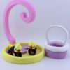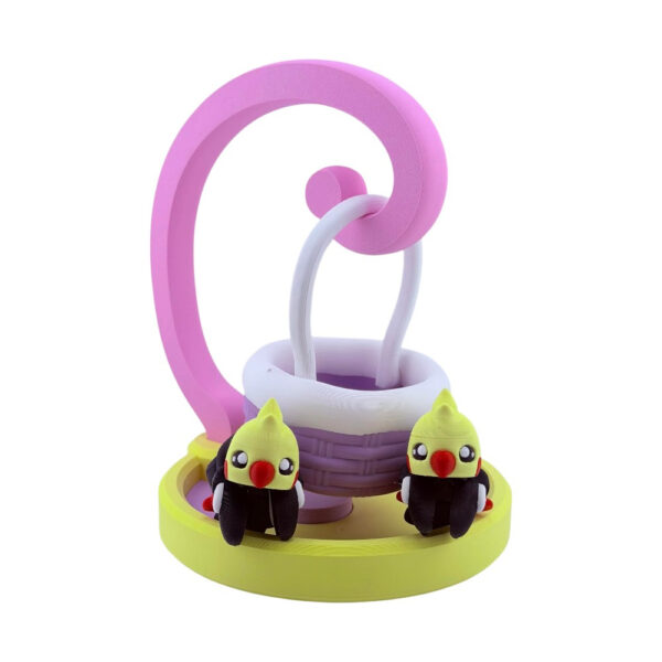 Urocza dekoracja wykonana w technologii druku 3D przyciąga uwagę pastelową kolorystyką, bajkową formą i starannie dopracowanymi detalami. Model przedstawia ozdobny koszyczek zawieszony na dekoracyjnym stelażu, uzupełniony dwoma uroczymi papugami które nadają całości wyjątkowo sympatyczny i dekoracyjny charakter. Połączenie różu, żółci, bieli i fioletu sprawia, że produkt prezentuje się lekko, estetycznie i bardzo efektownie.