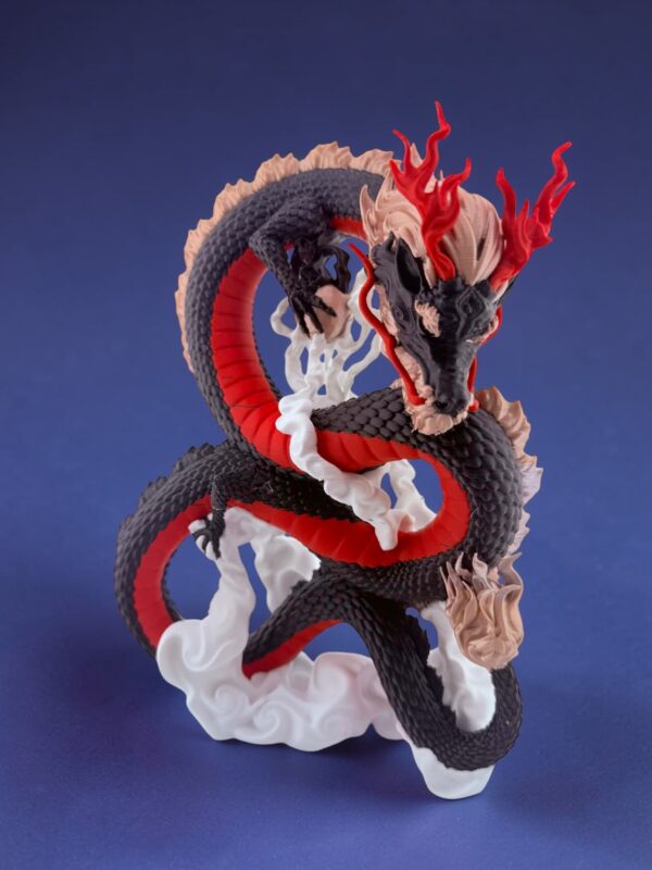 Wyjątkowy model dekoracyjny inspirowany orientalną estetyką i światem fantasy to efektowna propozycja dla osób, które cenią dopracowane detale, unikalne formy oraz nowoczesne wydruki 3D. Produkt przedstawia smoka o smukłej, wijącej się sylwetce, oplecionego wokół dekoracyjnej podstawy stylizowanej na chmury. Całość przyciąga uwagę wyrazistą kolorystyką, w której głęboka czerń została połączona z intensywną czerwienią oraz jasnymi akcentami podkreślającymi detale głowy, grzywy i ozdobnych elementów.