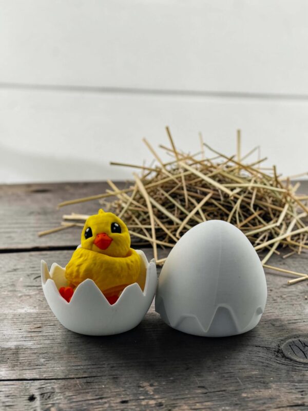 Model składa się z uroczego kurczaczka oraz osłonki w formie pękniętego jajka, co nadaje całości ciekawy i efektowny charakter. To doskonały wybór jako ozdoba na półkę, biurko, komodę lub jako element sezonowej dekoracji. Świetnie sprawdzi się również jako drobny upominek dla miłośników zwierząt, wiosennych motywów i wyjątkowych wydruków 3D.