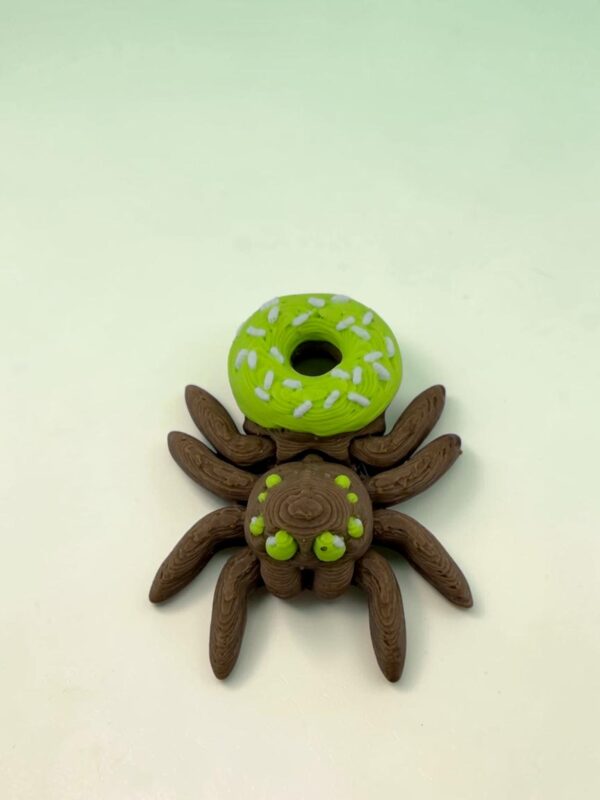 Uroczy mini pajączek z kolorowym donatem to wyjątkowa dekoracja dla miłośników nietuzinkowych dodatków, miniaturek i oryginalnych produktów wykonanych metodą druku 3D. Połączenie brązowego pajączka z limonkowym donatem tworzy zabawną i przyciągającą wzrok kompozycję, która wyróżnia się ciekawym wyglądem oraz starannie dopracowanymi detalami.
