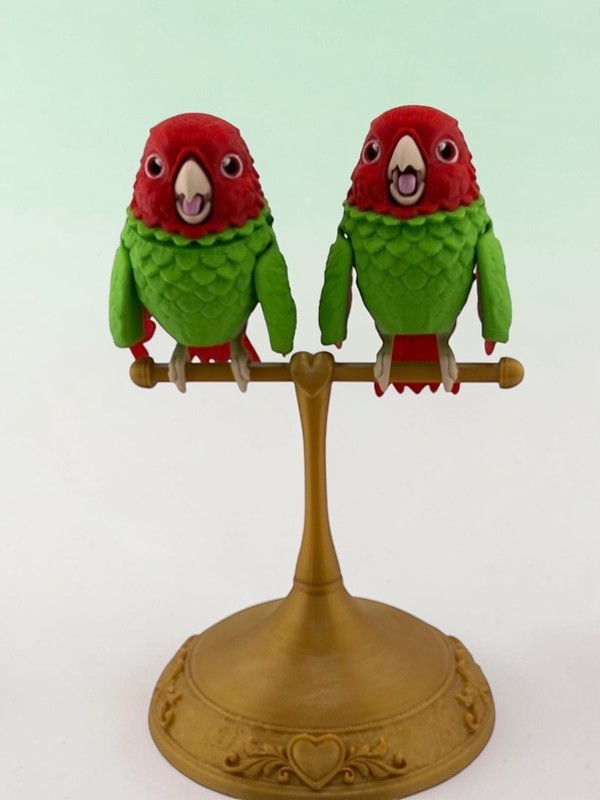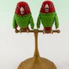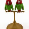 Dekoracyjna figurka przedstawiająca dwie kolorowe papugi siedzące na ozdobnym drążku. Intensywna kolorystyka – zielone skrzydła oraz czerwone głowy – sprawia, że figurka przyciąga uwagę i stanowi ciekawy element wystroju wnętrza. Papugi posiadają wyraźne detale piór oraz duże oczy, które nadają im przyjazny i dekoracyjny charakter.