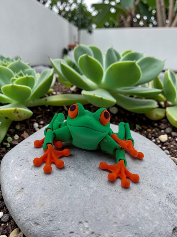 Wyjątkowy model dekoracyjny przedstawiający żabę to oryginalna propozycja dla miłośników zwierząt, natury i nietuzinkowych wydruków 3D. Produkt przyciąga uwagę żywą kolorystyką, dopracowanymi detalami oraz charakterystycznym wyglądem inspirowanym egzotycznymi żabami. Intensywna zieleń została połączona z wyrazistymi pomarańczowymi akcentami na łapkach i oczach, dzięki czemu całość prezentuje się niezwykle efektownie i dekoracyjnie.